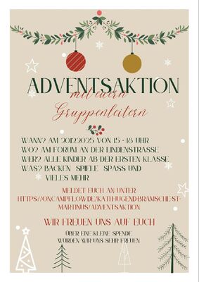 Schon gespannt auf Weihnachten? Wir auch! Deswegen bieten unsere Gruppenleiter eine Adventsaktion, für Kinder, an. Dabei wird sich mit backen, Spielen und Spaß auf Weihnachten eingestimmt.