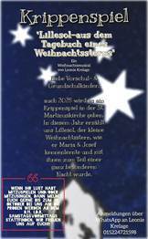 auch in diesem Jahr wird es wieder ein Krippenspiel in der St. Martinus-Kirche geben. Wir erzählen die Geschichte vom kleinen Weihnachtsstern Lillesol, der Maria und Josef kennenlernt und mit ihnen zum Teil einer ganz besonderen Nacht wird.