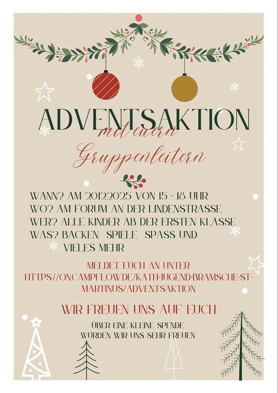 Schon gespannt auf Weihnachten? Wir auch! Deswegen bieten unsere Gruppenleiter eine Adventsaktion, für Kinder, an. Dabei wird sich mit backen, Spielen und Spaß auf Weihnachten eingestimmt...